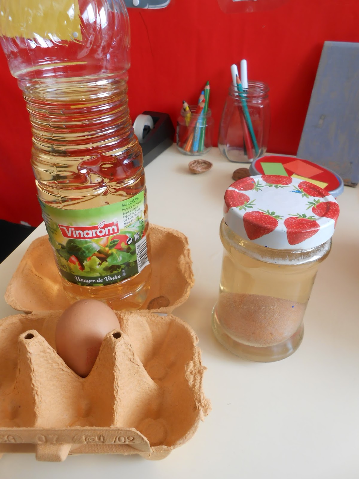 Ainda temos uma experiência a decorrer: um ovo colocado num frasco de vidro, cheio de vinagre. Vamos ver o que vai acontecer...